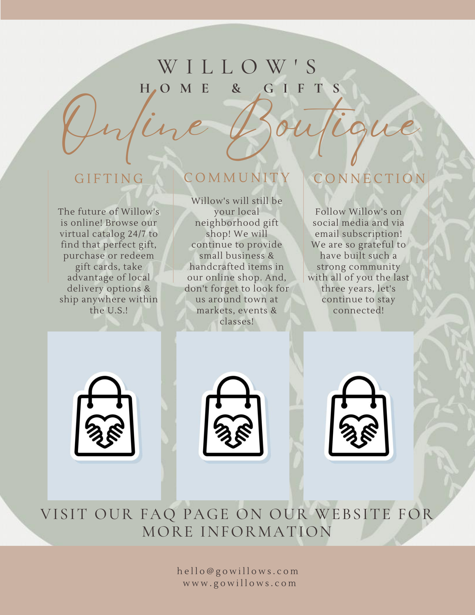 Willow's is retiring! 70% off site wide! Discount taken at checkout and all sales are final.